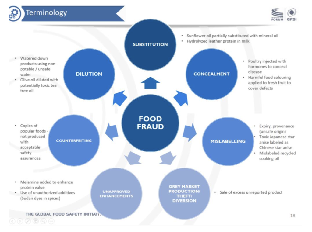À l’échelle de la législation européenne, il n’existe aucune définition de « fraude » dans la chaîne agroalimentaire1. Mais selon le CODEX ALIMENTARIUS (2019), la fraude alimentaire désigne toute action délibérée réalisée par une entreprise ou un particulier dans le but de tromper autrui sur l’intégrité d’un aliment ou d’obtenir un avantage non dû. La fraude alimentaire peut prendre les formes suivantes, notamment : frelatage, adultération, substitution, dilution, falsification, imitation, contrefaçon et présentation fallacieuse ou étiquetage trompeur2.