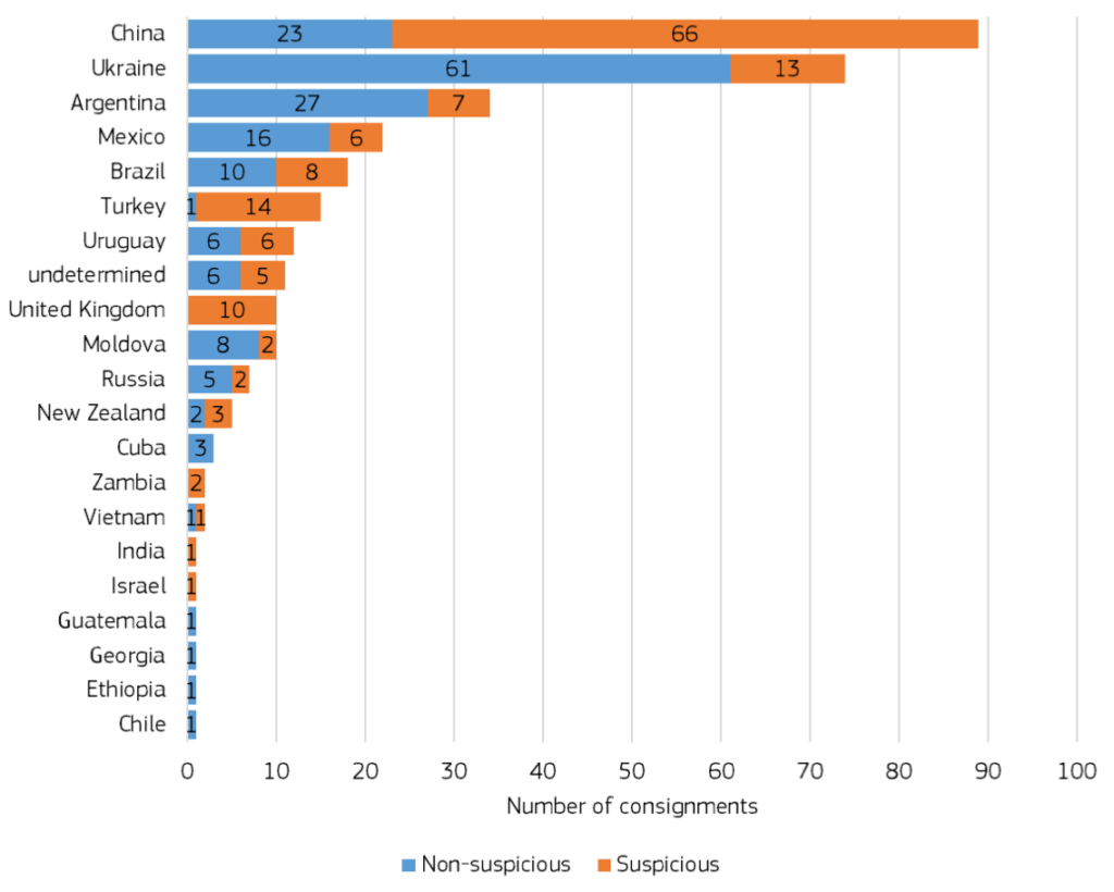 Face à ce constat, plusieurs actions ont été entreprises ces dernières années pour tenter d’identifier la présence de miel adultéré sur le marché européen. En 2023, la DG Santé a initié un projet visant à estimer la part de miel adultéré dans les importations au sein de l’UE. Sur les 320 échantillons de miels analysés par le JRC, 46% des échantillons étaient suspectés d’être adultérés, c’est-à-dire suspectés d’être non conformes aux dispositions générales de la Directive européenne sur le miel.