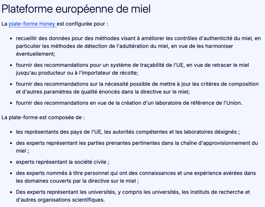 Lors du projet du JRC (2023), différentes méthodes ont été employées pour détecter les adultérations du miel par l’ajout de sirops de sucre. Cependant, les techniques de fraudes évoluent et davantage de méthodes harmonisées et validées doivent être développées pour préciser en continu la quantité de miels adultérés circulant sur le marché européen et augmenter la capacité de contrôle des laboratoires habilités. C’est ce que cherche à établir actuellement la nouvelle Plateforme européenne de Miel (Honey Platform) créée en 2024.
